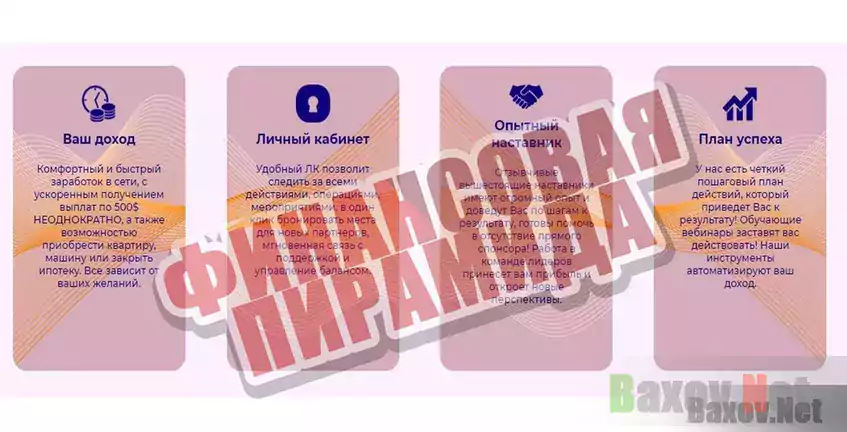 Обычный сайт, схожий со всеми другими финансовыми пирамидами. Главное отличие от реального инвестиционного проекта – отсутствие внятного объяснения, кто стал основателем компании, куда мы будем инвестировать, с чего будет появляться доход.