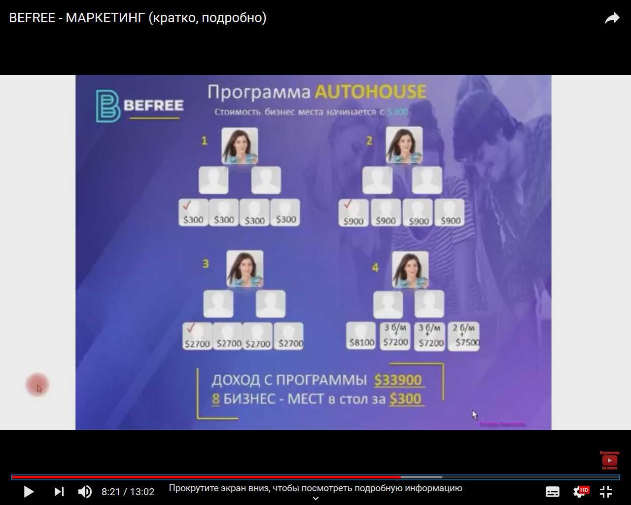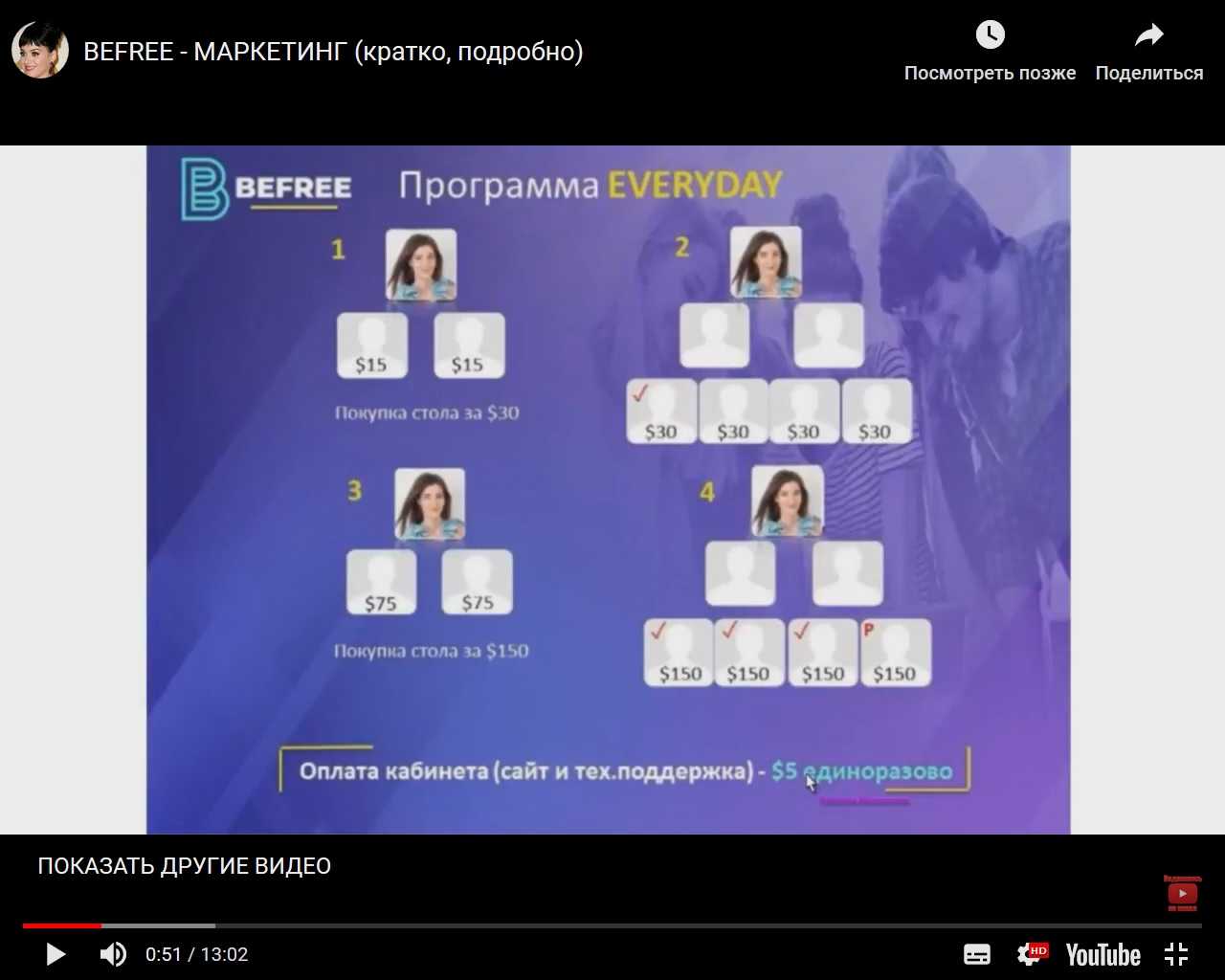 При посещении сайта befree-biz.com внимание привлекает презентация, размещенная на ютубе, в которой описаны 2 вариации получения прибыли от 2,87%/день. Представляют собой начисление процентов по первому вкладу с последующей покупкой столов