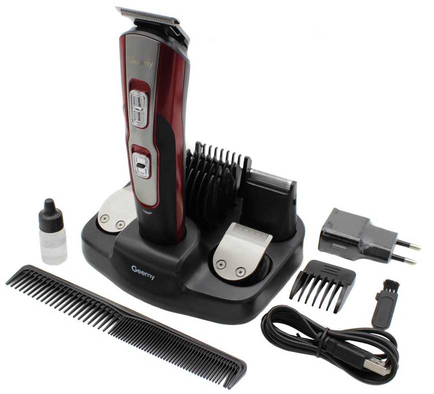 Уникальный набор, который закрывает все потребности парикмахера. Он позиционируется как универсальный. Работают устройства от аккумулятора и сети. Причём зарядка батареи может проходить даже во время стрижки – достаточно подключить машинку к розетке. Производитель выполнил набор в стильном дизайне и выбрал активную красно-чёрную цветовую гамму.