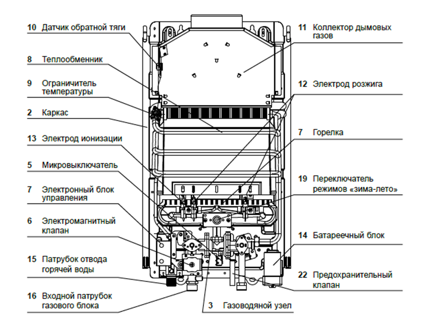 Характерное отличие всех нагревателей бренда — закрытая камера сгорания и два контура. Технические характеристики турбированных двухконтурных котлов предопределены их внутренним устройством: