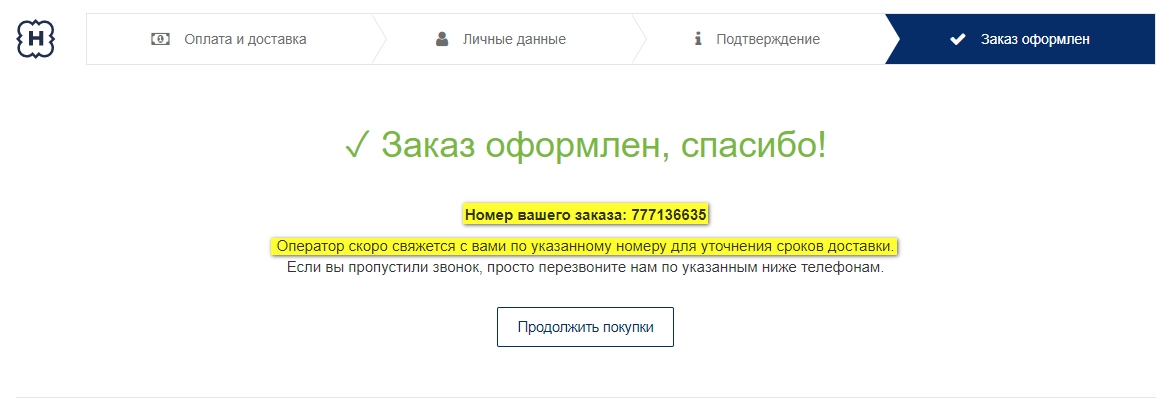 После подтверждения сайт перенаправит вас на страницу с уведомлением о взятии заказа в обработку.