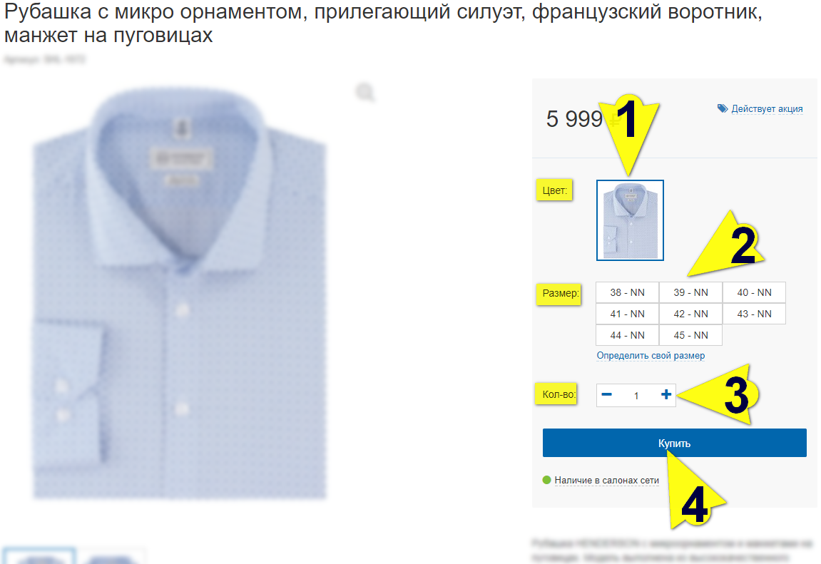 Определившись со своим выбором покупки, сначала выберите цвет изделия (вариантов может быть больше одного) 1), затем отметьте необходимый размер 2), при желании, если вам нужно больше одного экземпляра, воспользуйтесь опцией + 3), и добавьте товар в корзину 4).
