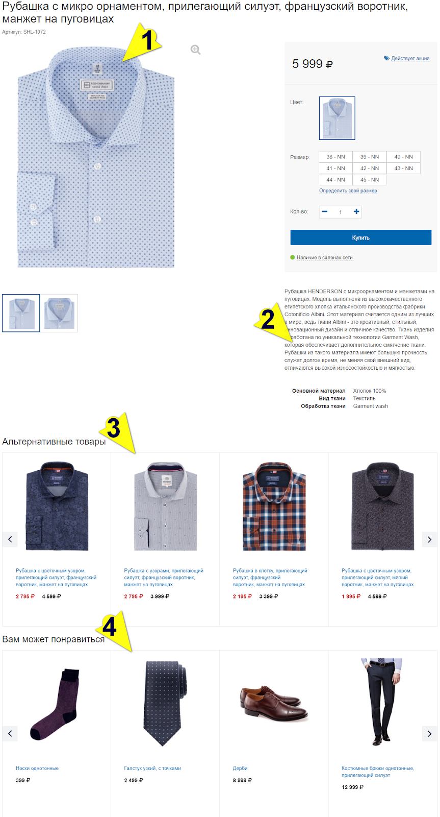 Описание товара достаточно содержательное: так, мы тут можем ознакомиться с несколькими изображениями 1), маленьким текстом с обзором особенностей изделия 2), а также несколько подборок других товаров, включающих альтернативные предложения 3) и дополнения к основному изделию 4).