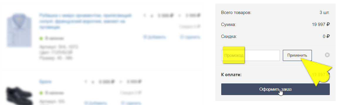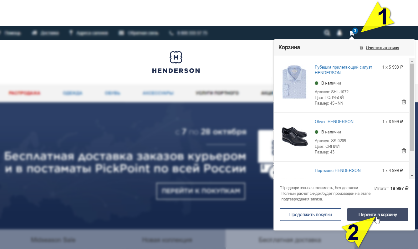 На верхней панели сайта, справа есть значок корзины со статусом добавленных товаров 1), кликните по нему, и во всплывающем окошке со списком товаров выберите опцию “Перейти в корзину”.