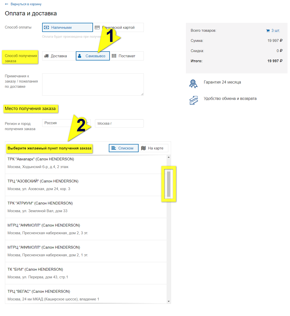 Выбрав вариант “Самовывоз” 1), в списке пунктов получения заказа 2) отметьте ближайший к вашему местоположению магазин.