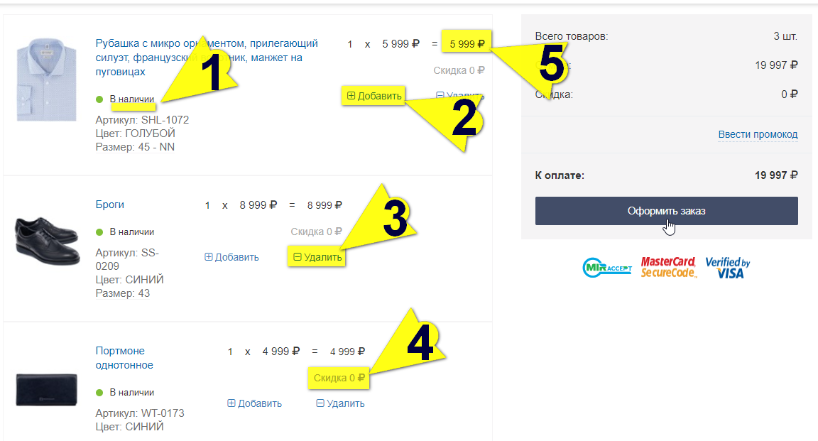 Сайт перенаправит вас на страницу предварительного просмотра, где вы сможете просмотреть добавленные товары еще раз по наличию 1), также можно отредактировать, добавив 2) или убрав ненужное 3), узнать о причитающейся за купленный товар скидке 4) и проверить общую стоимость заказа 5). Затем можно переходить к оформлению заказа.