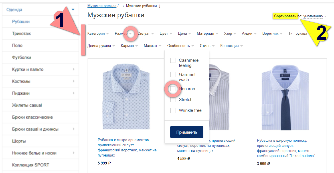 На странице каждого раздела присутствуют параметры подбора товаров: фильтры по типу, особенностям и некоторым характеристикам изделий 1), а также сортировка вида страницы по возрастанию или убыванию цены, популярности или алфавитному порядку позиций 2).