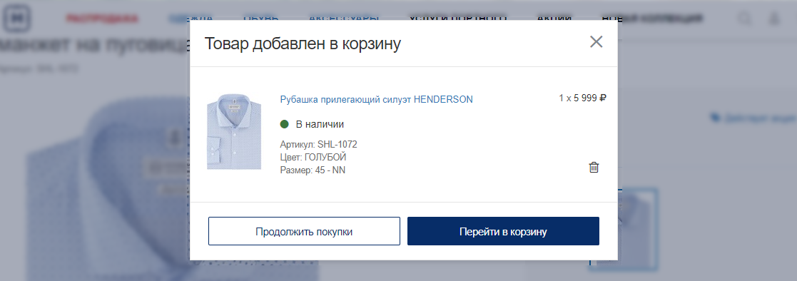 Во всплывающем окошке появится подтверждение о выборе товара для покупки.