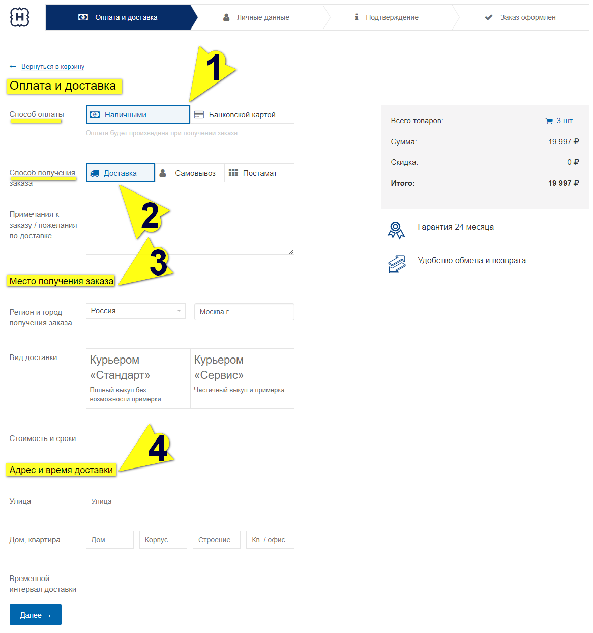 На странице оформления выберите подходящий вам вариант оплаты 1) и получения заказа. Для доставки по вашему адресу 2) отметьте свое местоположение 3) и введите адрес проживания 4).