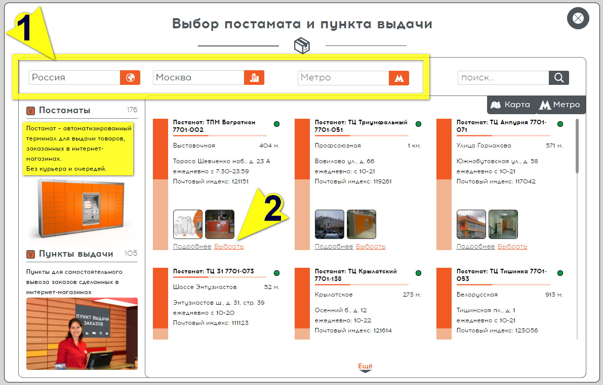 При выборе получения заказа в постамате во всплывающем окошке также отметьте свое местоположение 1) и в списке пунктов кликните по подходящему адресу.