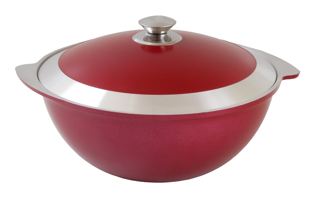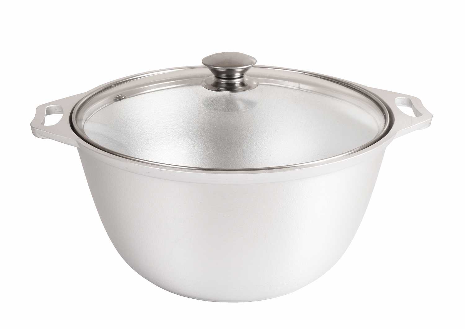Алюминиевая основа корпуса имеет толщину дна и стенок от 4,5 до 6 мм, что позволяет быстро и равномерно нагреваться, удерживая тепло. Объем жаровни 4 литра. Диаметр дна и верха — 21/26 см. Крышка выполнена из жаропрочного стекла с отверстием для выхода пара. Кастрюля имеет вес 2,5 кг, подходит для газовых и электрических плит. Можно использовать в духовом шкафу. Цена изделия – 1752 рубля.