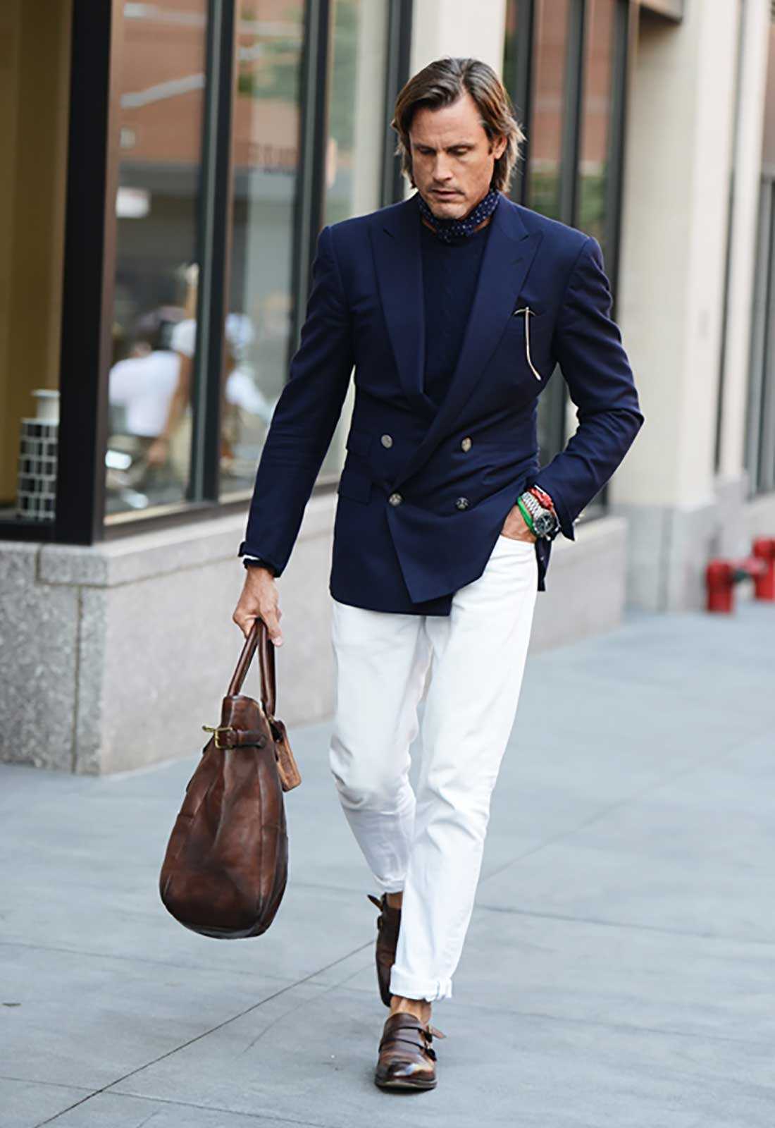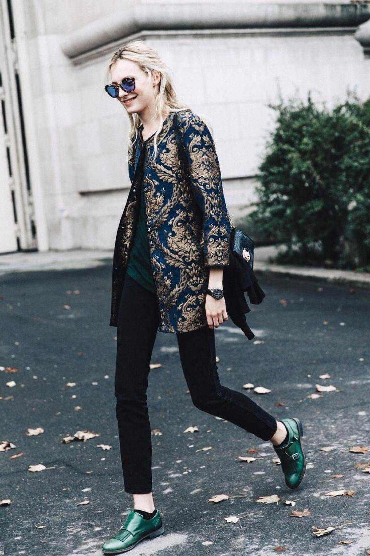 На брюках важно сделать подворот, немного оголив щиколотку и открыв застежки. Отлично в таких образах выглядят туфли с перфорацией либо же с цветным мыском.