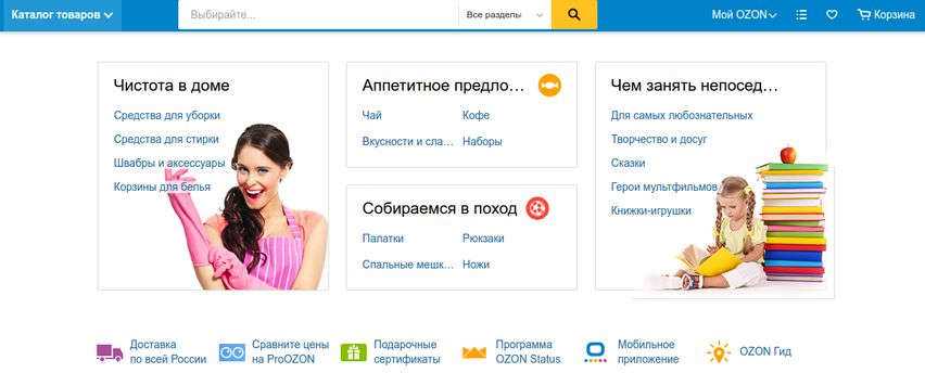 На сайте Озон представлен обширный ассортимент товаров. Каталог делится на разделы и подразделы, поэтому удобно найти нужную вещь: