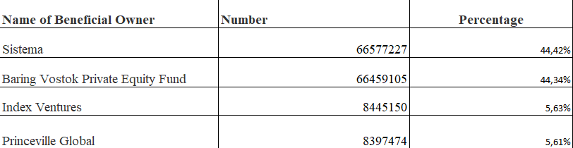 Прочими акционерами, владеющими в совокупности 8,9% компании являются члены Совета директоров и менеджмента «ПАО АФК «Система».
