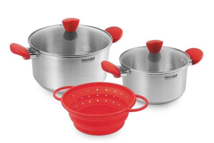 - Rondell – посуда данного бренда часто применяется в ресторанах из-за высокого качества и удобства использования. Продукция фирмы успешно протестирована и рекомендована к эксплуатации Национальной Гильдией шеф-поваров. В ассортименте торговой марки есть как классические серебристые кастрюли из стали, так и красные, черные, бирюзовые, оранжевые изделия.