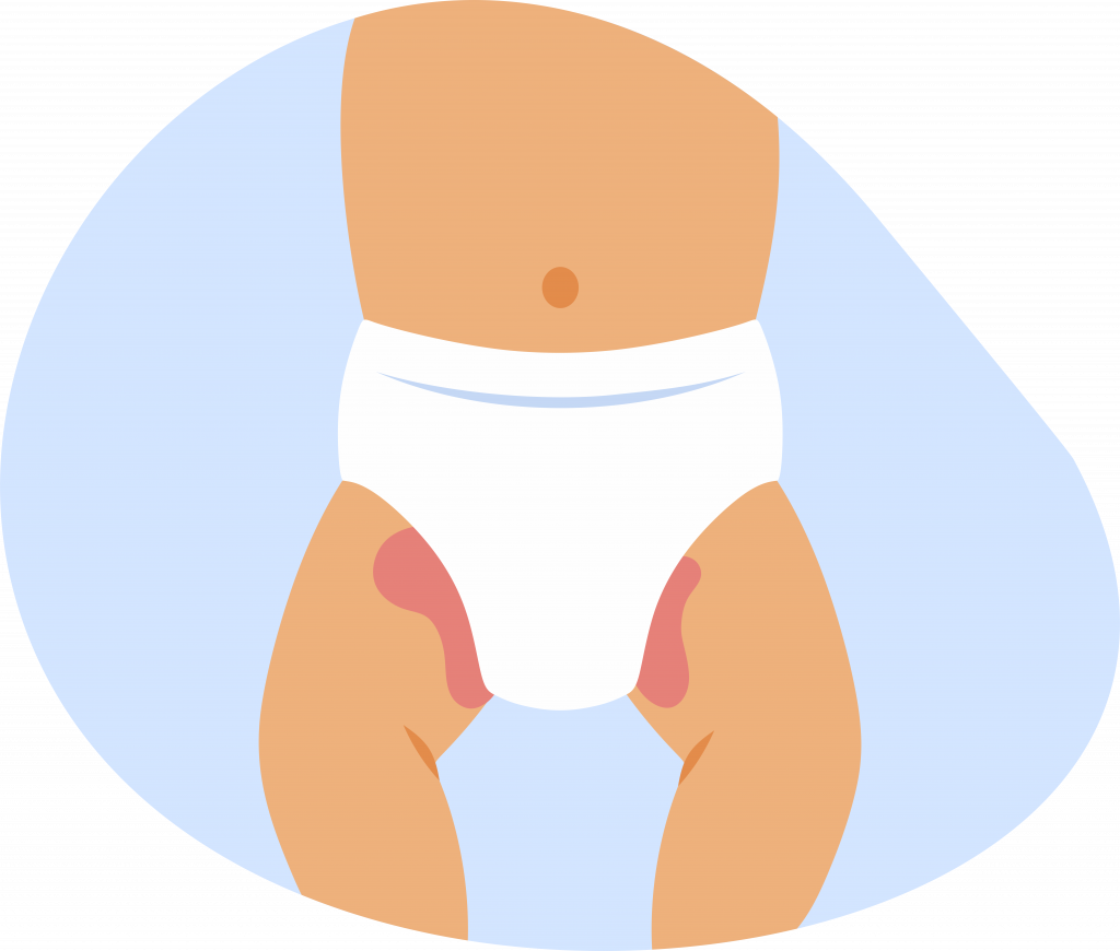 Пеленочный дерматит — «мокрая» сыпь и покраснение в области ягодиц, которые возникают из-за постоянного соприкосновения с калом и мочой и перегрева кожи под памперсом. Необходимо менять подгузник или пеленку как можно чаще, устраивать воздушные ванны и использовать защитный крем. Подсушить мокнущие места помогут средства на основе цинка (например, «Деситин», цинковая мазь), снять воспаление — заживляющие бальзамы («Бепантен» и другие).