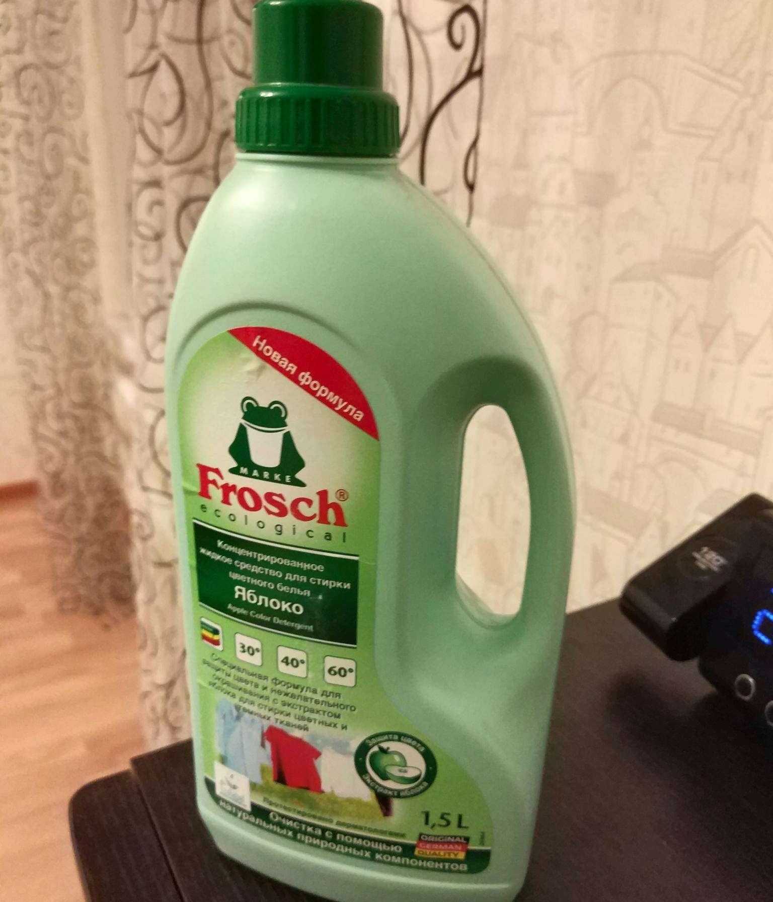 Гель-концентрат FROSCH является еще одним универсальным средством, получившим высокую оценку от покупателей. Он эффективен в использовании, подходит для любого варианта стирки, и применяется для всех типов тканей без исключения, вне зависимости от их состава.