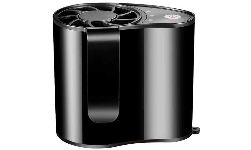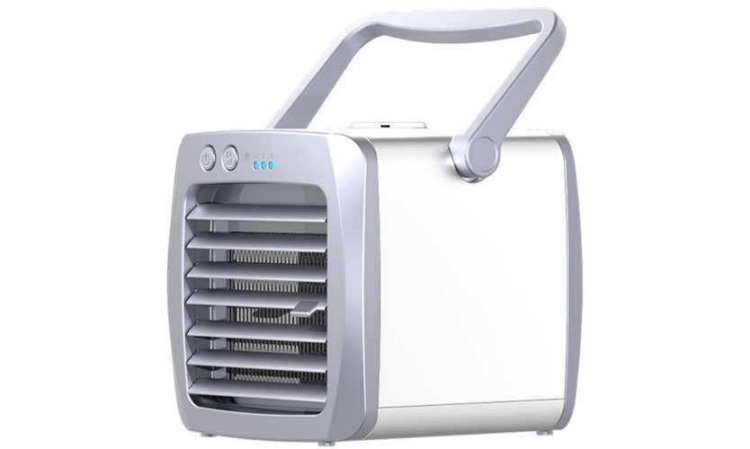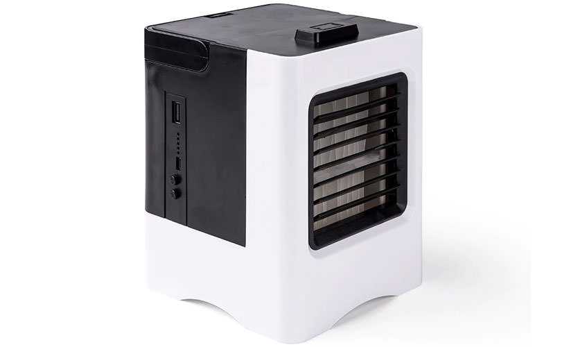 Цена — 750 рублей. Небольшой кондиционер с подключением к USB, может использоваться в пути, машине, кемпинге. Три скорости работы, небольшой вентилятор. Может цепляться на пояс, использоваться во время бега или ходьбы. Питается от встроенной Li-ion батареи ёмкостью 2000 мАч. Строгий дизайн в минималистическом стиле, корпус чёрного цвета. Мотор работает с мощностью 1.5 Вт. В комплект входит USB провод.