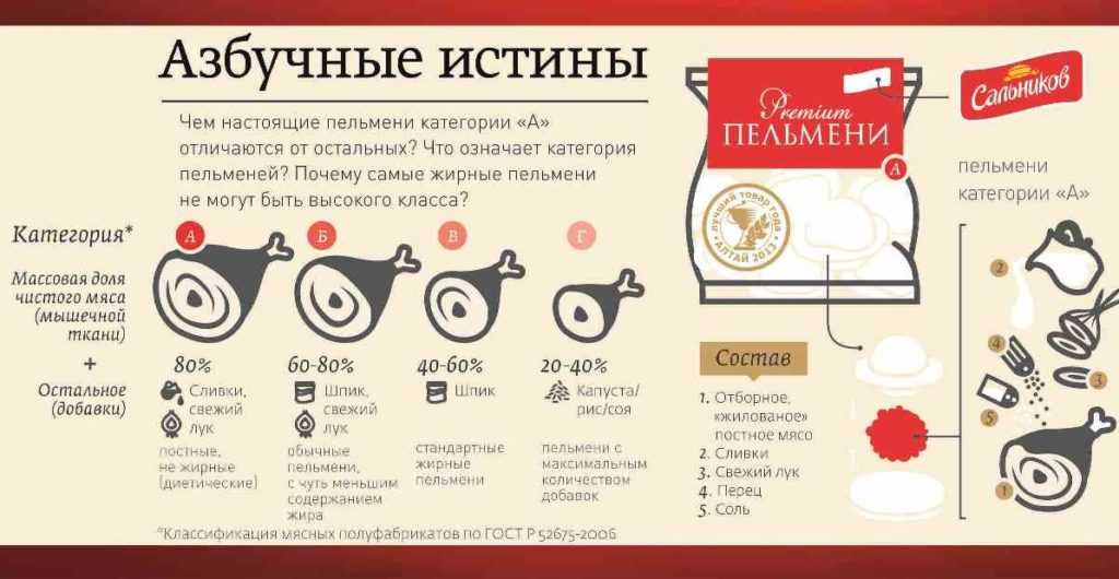 Найти полуфабрикаты категории А достаточно сложно. Производители добавляют в фарш различные специи, лук, вот и получается, что на мясо остается менее 80 %. Так что при покупке смело выбирайте полуфабрикаты категории Б, В – будет не менее вкусно.