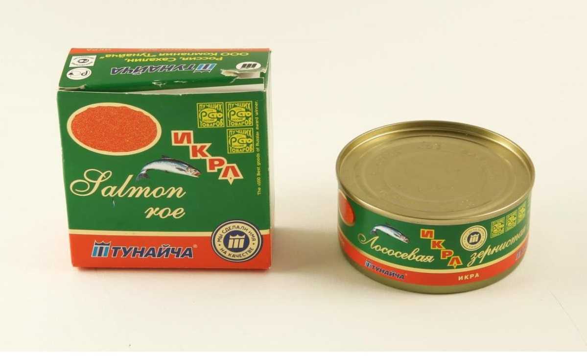 - Лучшая тара для икры — стеклянная, в жестяной банке невозможно оценить качества продукта на глаз: количество жидкости, размер и наличие раздавленных икринок.