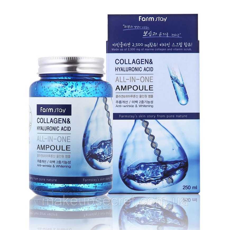 | Farmstay All-In-One Collagen & Hyaluronic Acid Ampoule | регулярно | питание, отбеливание, увлажнение, улучшение цвета, от морщин | 250 | непереносимость составляющих | от 625 до 1630 |