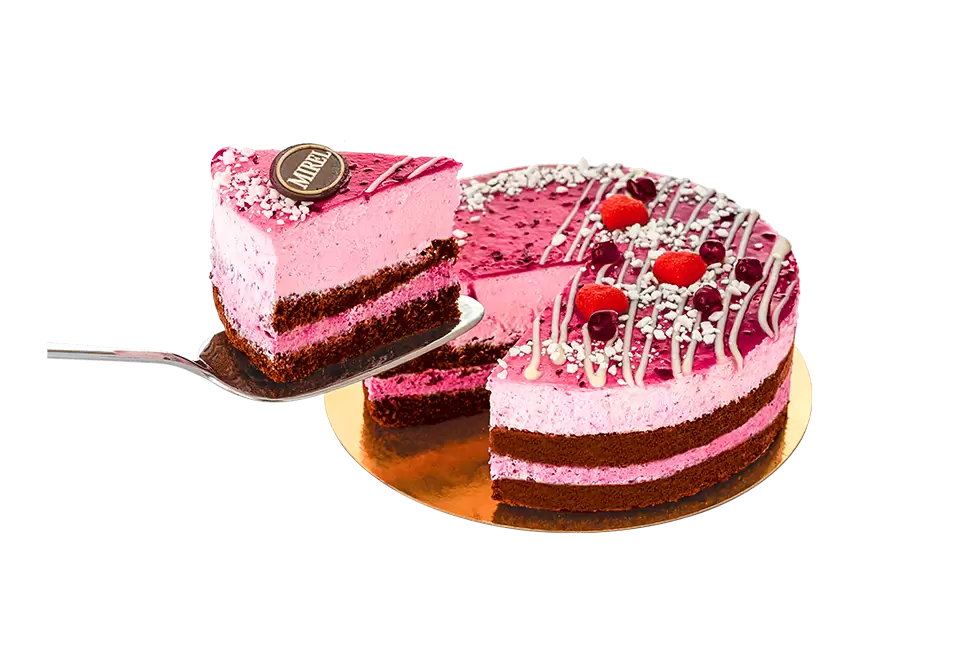 Яркий нарядный торт с нежнейшей структурой, смородиново-малиновым ароматом и ягодной начинкой – мечта сладкоежек. Основа торта – два шоколадных бисквитных коржа средней степени влажности. Между ними толстым слоем проложен воздушный творожный мусс, нижний слой со вкусом черной смородины, верхний – малиновый. Сверху торт украшен тонким слоем ягодного желе насыщенного красного цвета, желейными шариками (имитация ягод смородины) и декором из мастики в виде сердечек. При нарезании торта кусочки сохраняют форму и выглядят очень аппетитно.