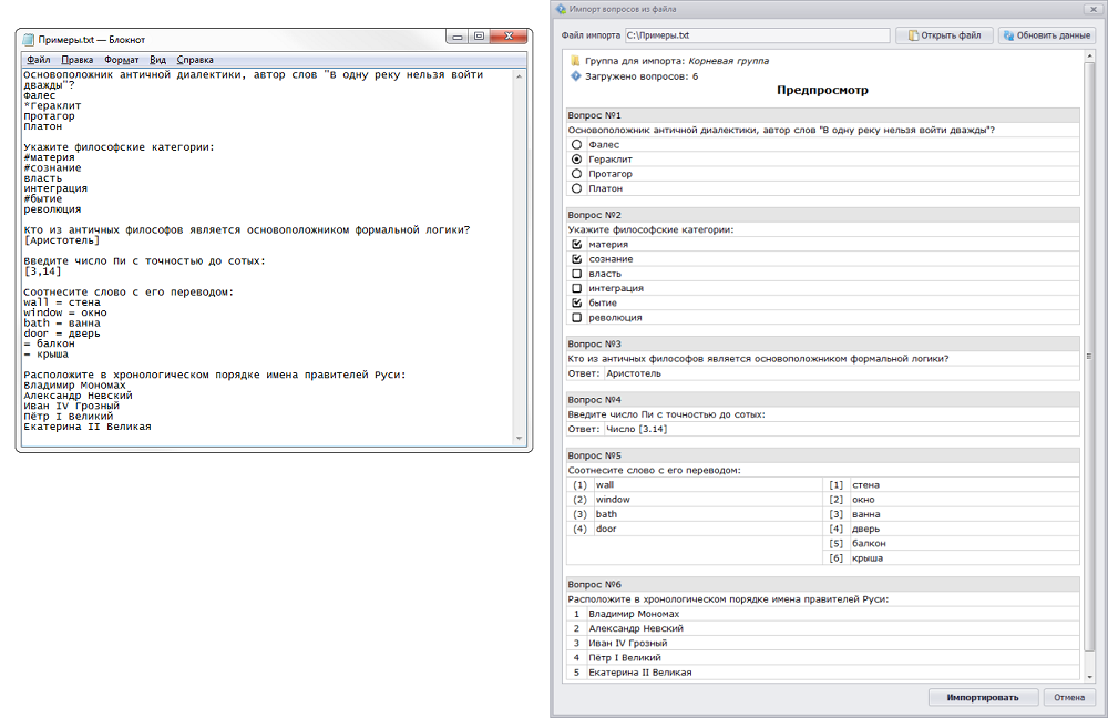 В случае импорта, вам нужно создать текстовый файл, заполнить его по шаблону и загрузить в программу. Вот так выглядит пример текста и меню импорта: