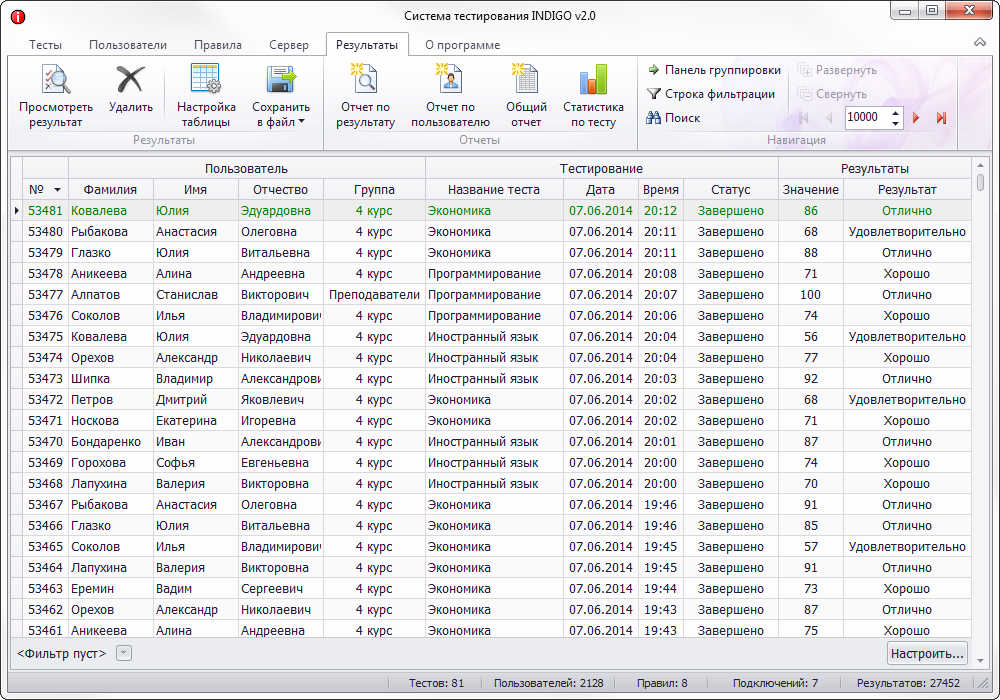 Статистику можно посмотреть во вкладке Результаты. При переходе во вкладку вы увидите краткую информацию по пользователям и результатам тестирования в виде таблицы: