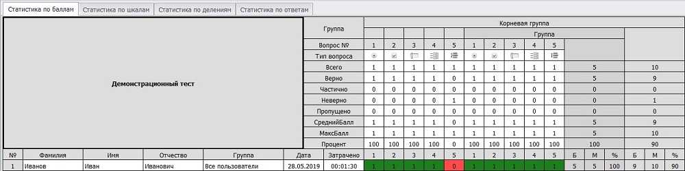 - Статистика по тесту. Показывает матрицу ответов по группам и пользователям