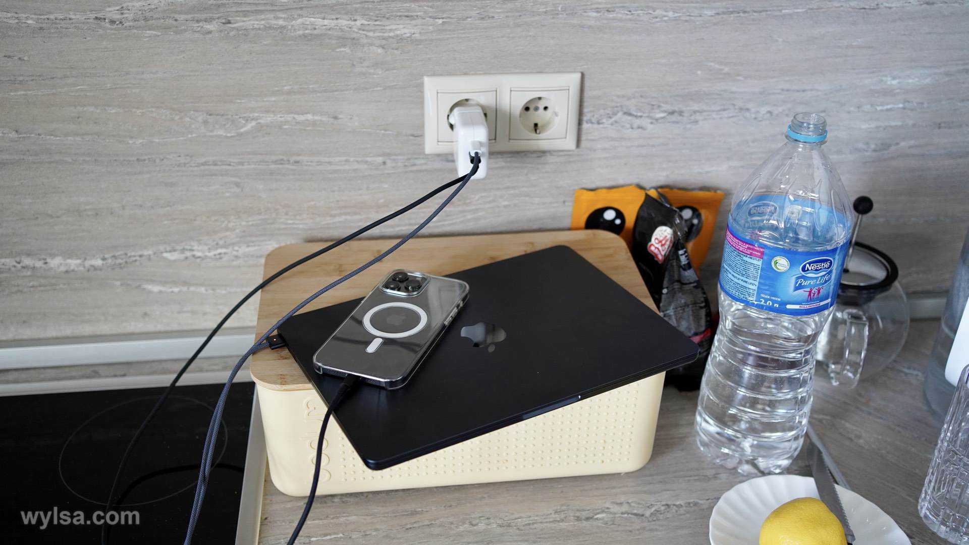 В комплекте могут быть разные зарядки. С нашим ноутбуком шла версия с двумя USB-C на 35W, есть ещё модель на 30W, её добавляют в комплект к самым простым Air. Два порта USB-C, безусловно, хорошо — можно сразу же заряжать и телефон, и ноутбук, но не забывайте, что в таком случае падает скорость зарядки. Я бы рекомендовал докупить зарядку на 67W — с ней начинает работать быстрая зарядка (ноутбук заряжается до 50 % за полчаса).