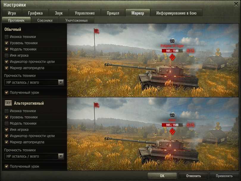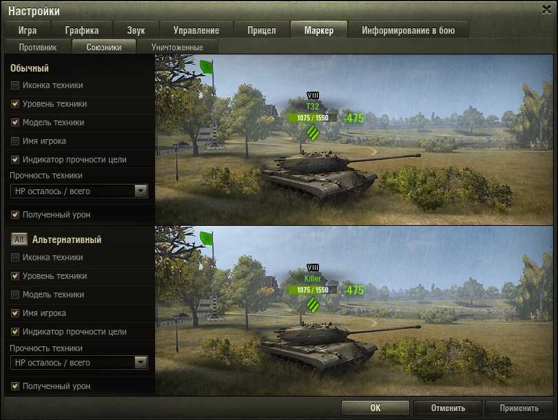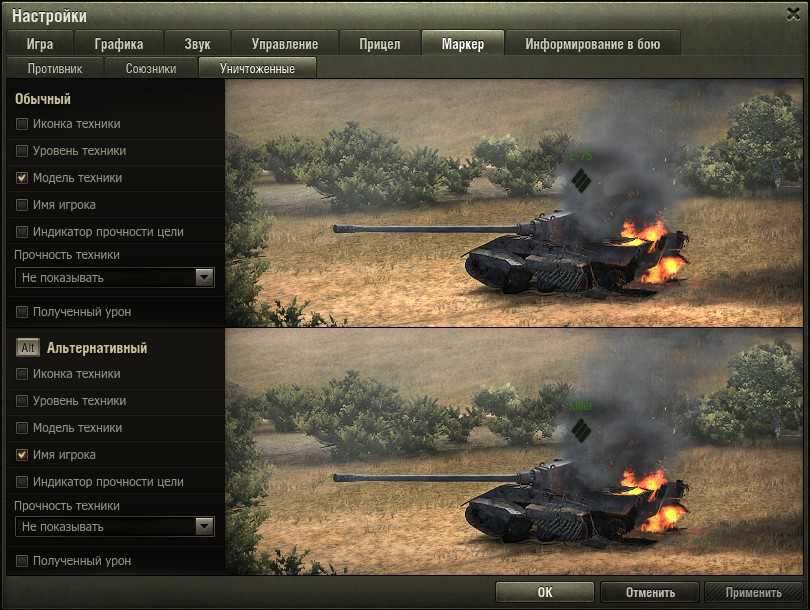 Здесь настраиваются маркеры над танками противников, союзников и уничтоженной техникой.