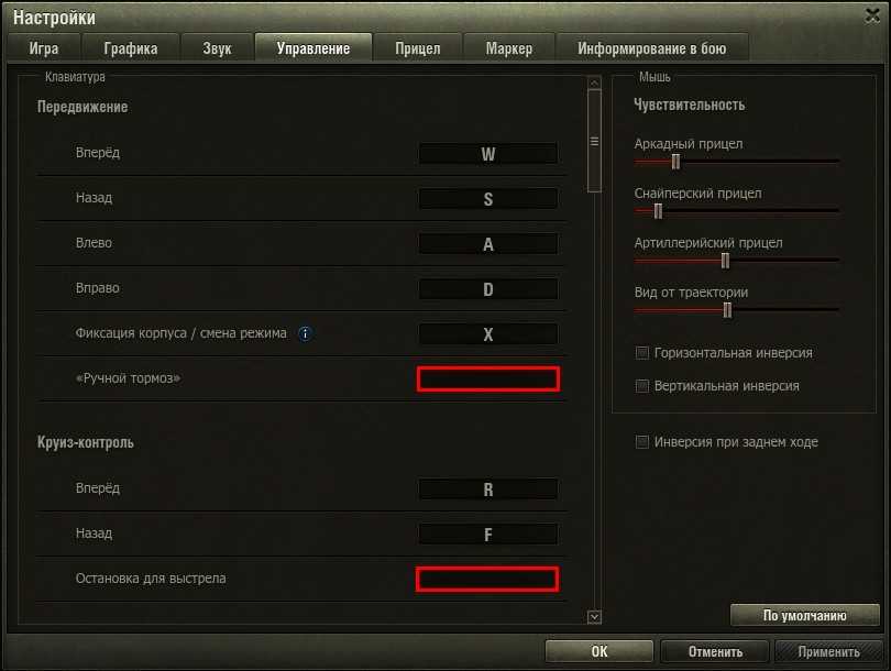 Также я открепил клавишу «Пробел» (Space) от ручного тормоза и остановки для выстрела, так как использую ее в (очень рекомендую).