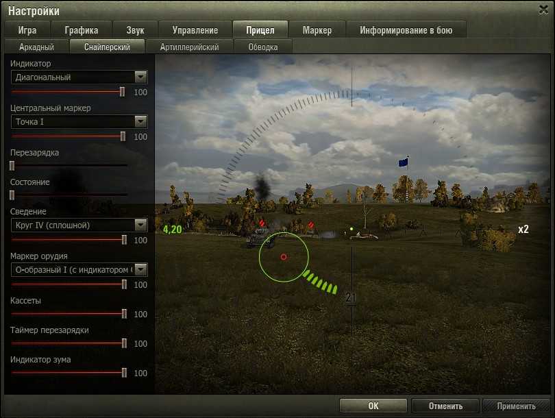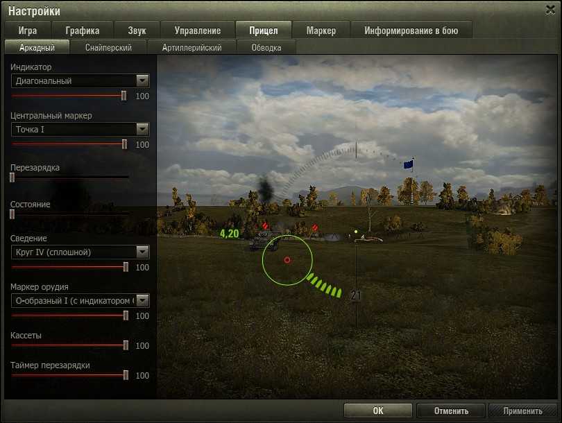 Сейчас я использую стандартный диагональный индикатор с зеленой точкой в качестве центрального маркера, сплошным кругом сведения и О-образным индикатором бронепробития, как и многие другие игроки. Так же рекомендую прозрачность индикаторов «Перезарядка» и «Состояние» выкрутить на минимум, чтобы они не мешали.