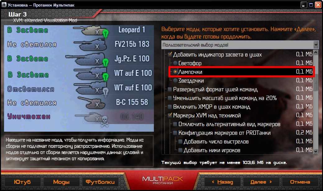 Что касается функции XMQP – она добавляет лампочку над танками союзников (у которых установлен мод XVM и прокачен перк «Шестое чувство» у командира танка). Если лампочка загорается, значит союзник засветился. Это также ценная информация, которая поможет вам вовремя остановиться и не попасть под огонь противников.