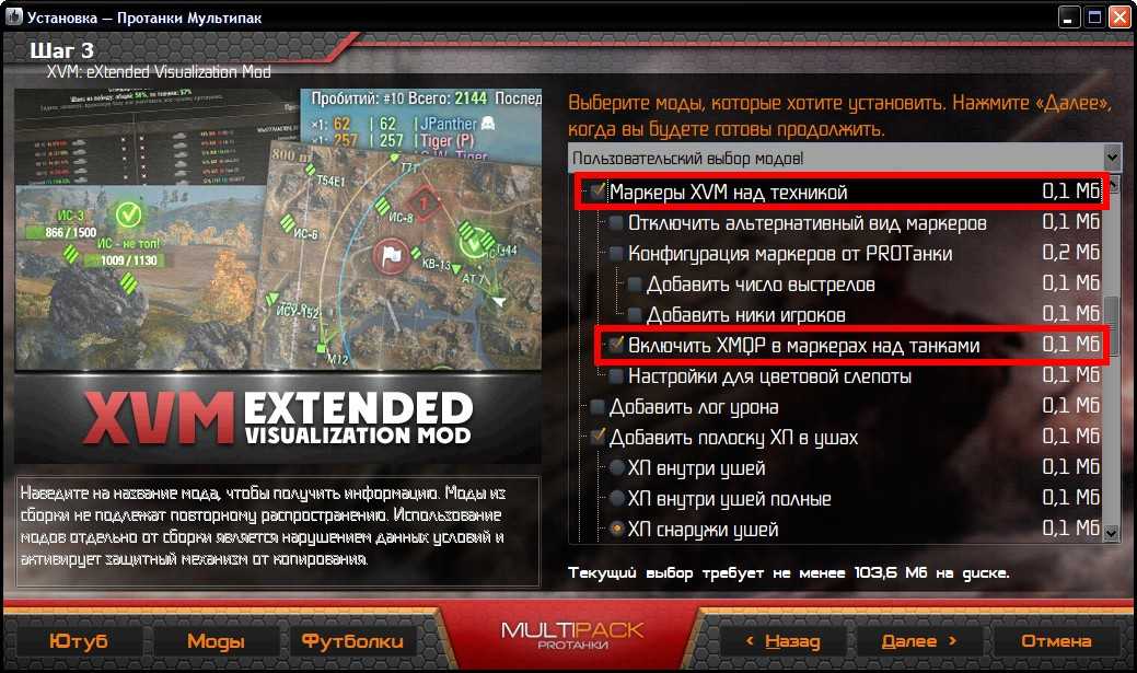 Ниже на этой же вкладке можно включить «Маркеры XVM над техникой», а также «Включить XMQP в маркерах над техникой».