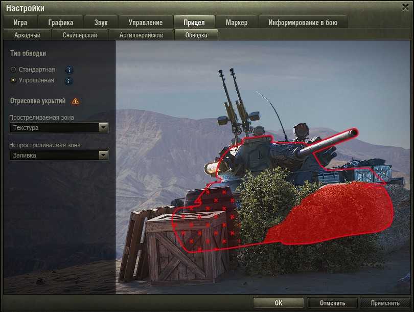 Сделайте как у меня и вы будете точнее видеть контур танка (без декоративных элементов), простреливаемые зоны за разрушающимися объектами («Текстура») и непростреливаемые зоны за укрытиями («Заливка»).