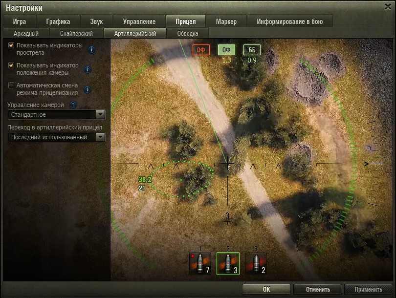 Первое, на что я хочу обратить внимание для тех, кто играет на арте – возможность «Добавить прицел АРТ-САУ» на миникарту, по которому можно сравнительно точно наводиться на пропавшего из засвета противника