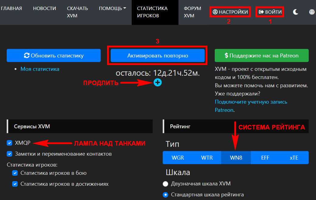 Учтите, что каждые 14 дней нужно делать продление с помощью кнопки «+» на сайте (сколько у вас еще осталось дней вы будите видеть в центре уведомлений при запуске игры, там же есть ссылка на сайт XVM).