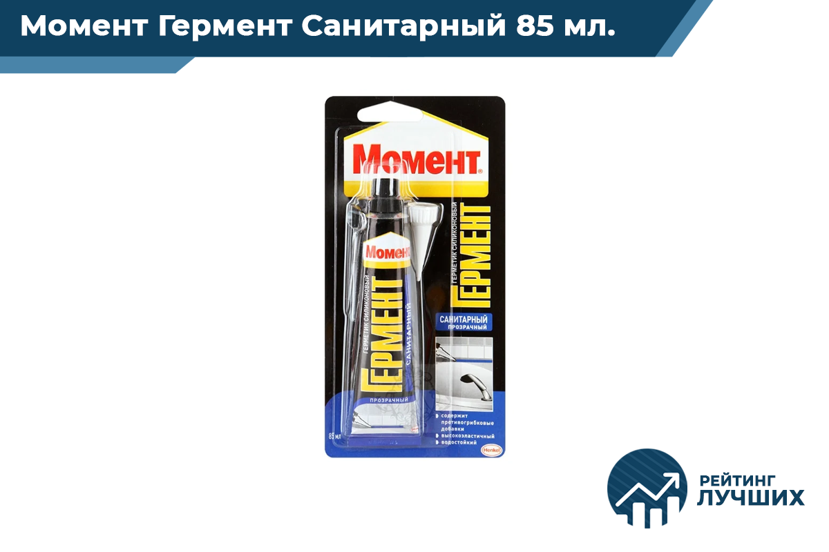 Наш рейтинг герметиков для ванной возглавляет силиконовый состав Момент Гермент Санитарный 85 мл. Предназначен для заделки швов в любых влажных помещениях, а также используется для наружного применения.