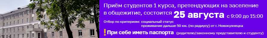 Колледж располагает четырехэтажным благоустроенным общежитием, расположенным по адресу: г. Новокузнецк, ул. Пирогова, д. 5.