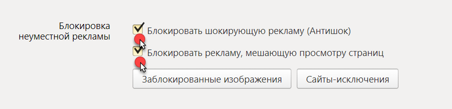 Вы попадёте на страницу настроек браузера. Прокрутите страницу ниже до раздела «Блокировка неуместной рекламы».