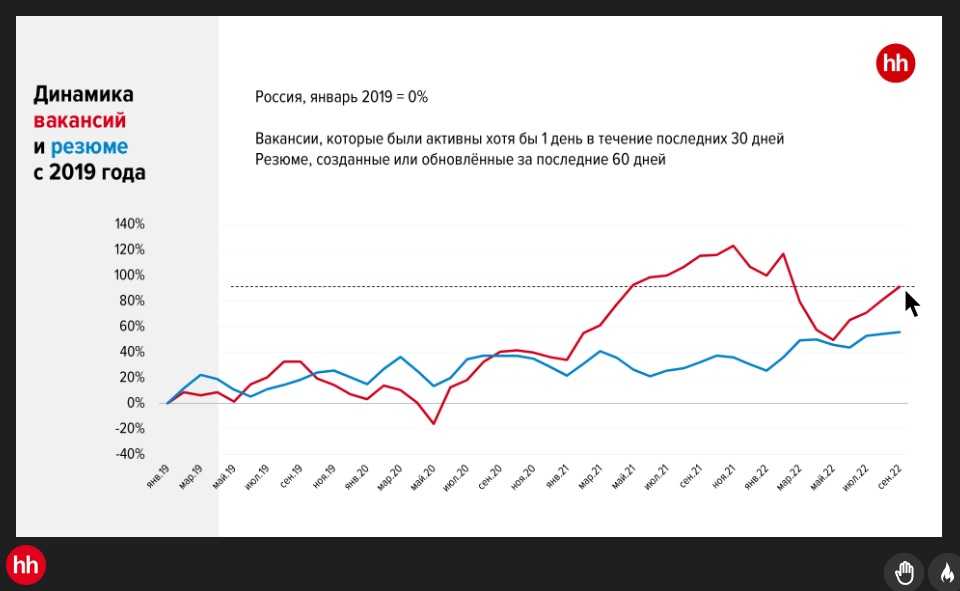 Рынок труда в России быстро оправился от пандемии 2020-2021 годов. Количество вакансий к началу 2022 года выросло от показателей января 2019 года более чем на 100%, а количество размещенных резюме — на 40%.
