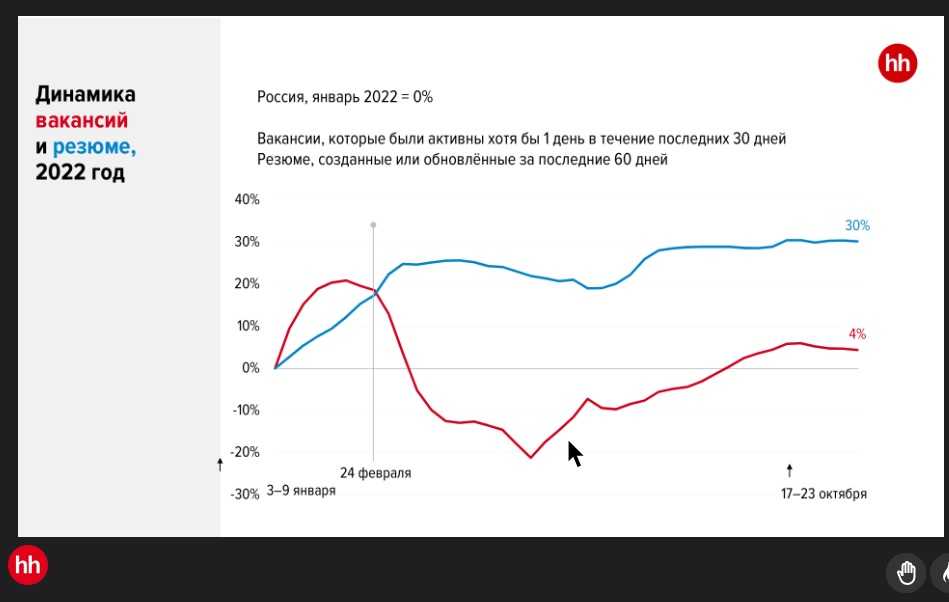 С начала СВО в феврале 2022 года рынок труда к сентябрю также восстановился и даже вырос. В октябре-ноябре также наблюдается рост числа вакансий. Но причина роста — призыв сотрудников, хотя в масштабах всей страны его показатель составил всего на 4-5% от уровня , что не критично для экономики. Женщин стали приглашать на работу больше, но это также влияние того, что мужчины стали менее доступны. В частности, больше женщин работодатели стали нанимать в традиционно мужских отраслях — транспорт и логистика, добыча, строительство.