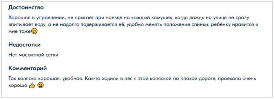 Коляска имеет преимущественно хорошие отзывы со стороны пользователей. Это классическая модель без поворотных колес. Последний факт для некоторых является недостатком, другие же уверены в том, что это позволяет легче направит транспорт туда, куда нужно. Положение ручки настраиваться под рост, спинка люльки тоже регулируется и имеет 3 позиции. Все тканевые элементы легко снимаются и быстро отстирываются в машинке. Вентиляция обеспечивается благодаря москитной сетке внутри капора.