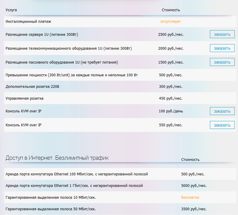 Стоят услуги по размещению сервера относительно недорого. Само размещение сервера обойдется в 2500 рублей в месяц. Интернет с гарантированными 10 Мбит/с или негарантированными 100 Мбит/с идет бесплатно при аренде порта коммутатора Ethernet — 500 рублей в месяц. Если такого канала тебе мало, то можно или купить гарантированный канал 50 Мбит/с (3500 рублей в месяц), или взять порт с негарантированной полосой 1 Гбит/с за 5000 рублей в месяц.