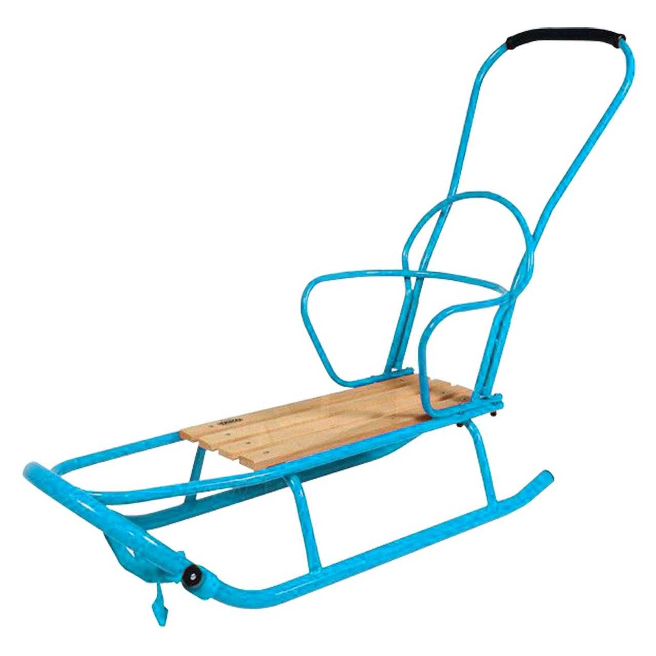Форма классическая — металлическая основа с полозьями, сиденье из поперечных реек, небольшая спинка из металла. В комплекте ручка-толкатель, буксировочный трос. Ручку можно снимать, чтобы использовать их для активных игр и катания с горок. Универсальное предложение имеет простейшую форму. Модель продается в магазинах относительно недорого, если сравнивать с ассортиментом других брендов. Это действительно одно из простейших и демократичных предложений рынка. Для зимних развлечений их вполне достаточно, если планируется менять через год или два.