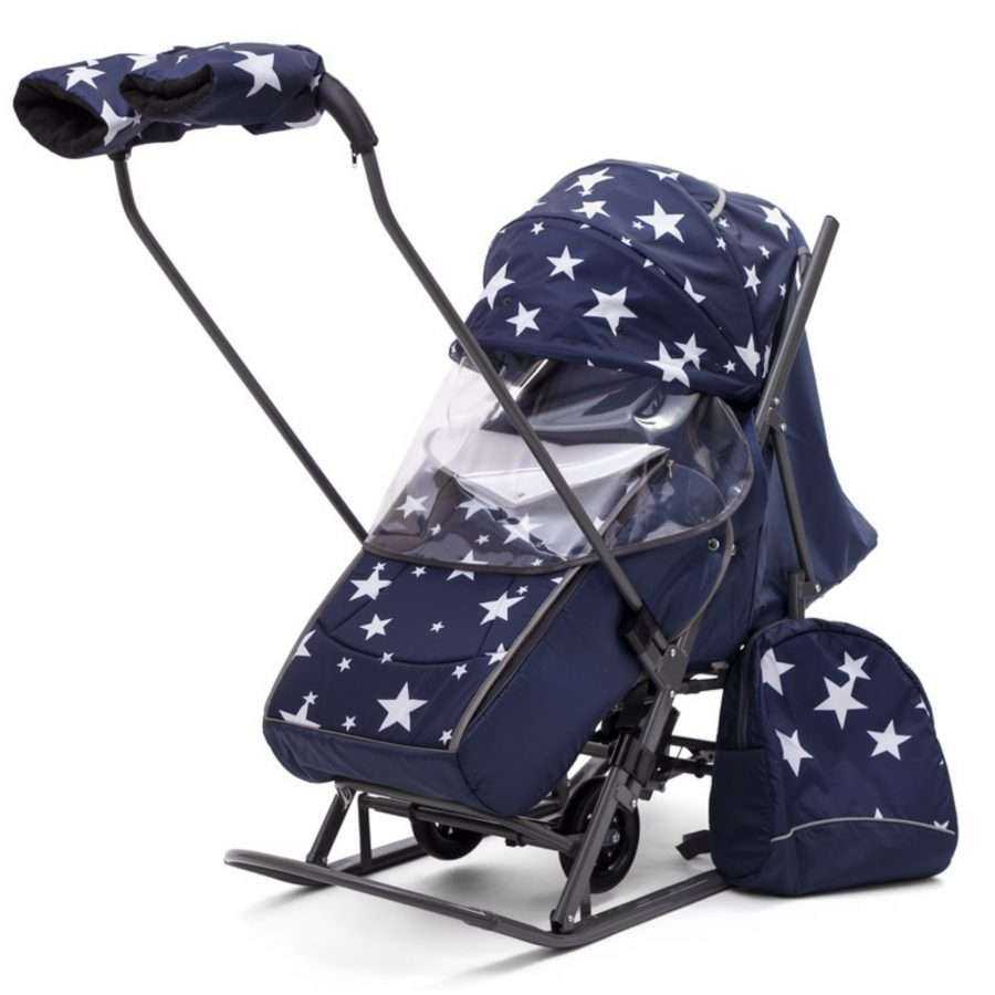 Эта красивая и стильно оформленная коляска может передвигаться по любой поверхности. Такое стало возможным благодаря наличию полозьев и выдвижных колёс. Среди других особенностей модели выделяют её небольшие габариты, что значительно упрощает перенос и хранение устройства в квартире. Устройство Pikate Звезды – это недорогая зимняя коляска с откидной спинкой, которую можно зафиксировать в трёх различных положениях. Также модель оснащена перекидной ручкой, матрасом, чехлом для ног, сумкой. Бонусом для покупателей станет наличие варежек, закреплённых на толкателе.