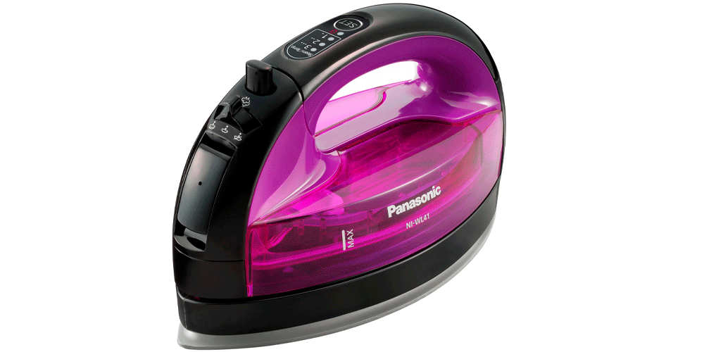 Шестое место занимает беспроводной утюг Panasonic NI-WL41VTW. Это модель довольно нетипичного дизайна округлой формы. Уникальна и форма подошвы, в которой оба конца заужены. В сочетании с беспроводной конструкцией это предоставляет максимум комфорта при проглаживании любых деталей. Подошва керамическая, благодаря ей минимизирована вероятность пригорания и загрязнения. Габариты утюга небольшие – 22х10х13 см, поэтому он достаточно манёвренный, например, при проглаживании между пуговиц. Утюг нагревается и хранится на станции электропитания. Это обеспечивает дополнительную безопасность при использовании и предотвращает риск опрокидывания. Резервуар для воды объёмом 135 мл у модели съёмный, что облегчает наполнение.