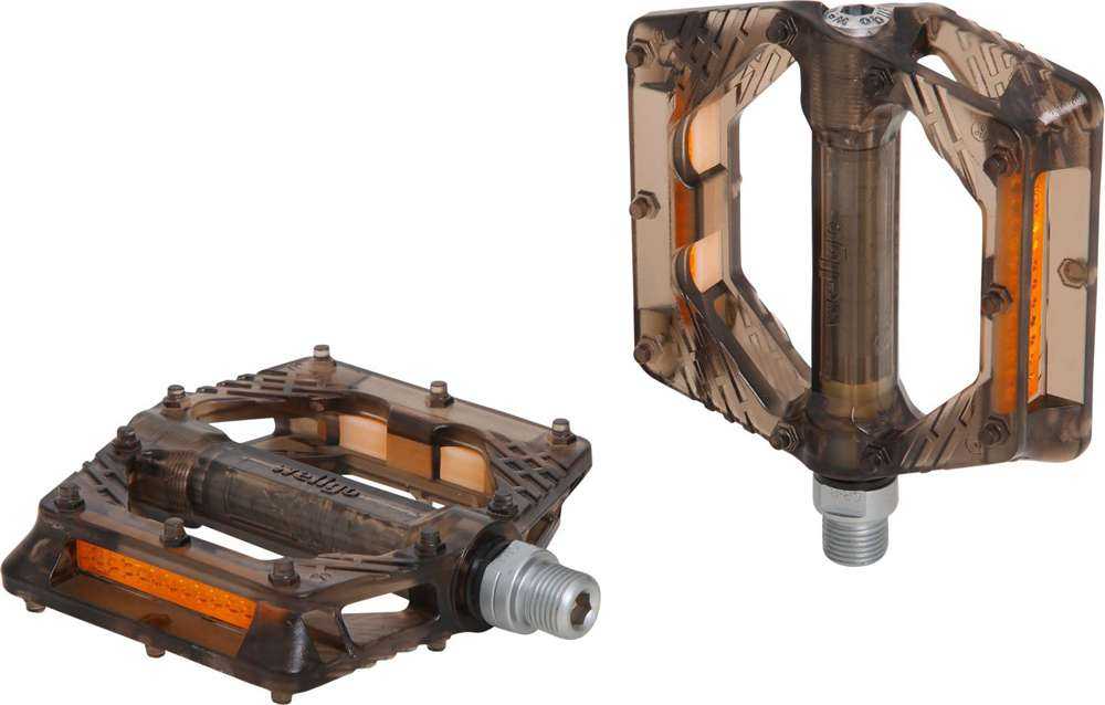 Далее на очереди изделие, полюбившееся многим любителям как горных велосипедов, так и стиля ВМХ. Прозрачная полимерная основа способна удивить запасом прочности и приковать любопытные взгляды. Пластиковая основа создана по запатентованной технологии производителя, что обеспечивает достаточную устойчивость к ударным нагрузкам. Также основа обладает достаточной прочностью для установки промышленных подшипников. Самым интересным пользователи считают полную прозрачность, таким образом можно детально рассмотреть, что происходит внутри корпуса. К недостаткам велосипедисты относят невозможность сменить изношенные шипы, что говорит о предстоящей полной замене педали, и значительно сказывается на возможности многолетнего применения.