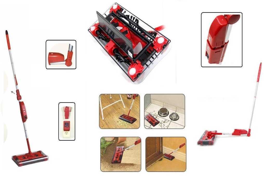 Внешне электровеник похож одновременно на вертикальный пылесос и обычную швабру. Прибор состоит из короба компактных размеров и присоединенной к нему рукояти на шарнирах. Внутри расположены щетки, обычно сразу несколько, хотя в некоторых моделях насадка может быть и одна. При включении электровеника элементы начинают быстро вращаться вокруг своей оси, их щетина подцепляет мелкий мусор и проталкивает его в контейнер для сбора грязи.
